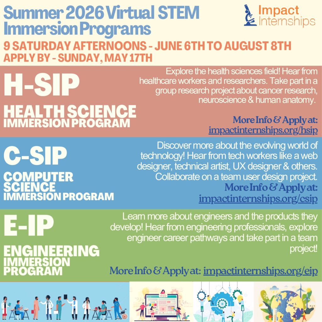 Impact Internships believes in the unlimited potential of education combined with purposeful career and life planning to change a young person’s life for the better. Through immersive STEM enrichment programs, our non-profit aims to introduce high school students to opportunities in science at a critical moment in their lives when it can make the greatest impact. Through hearing from real-world practitioners, engaging in interactive workshops and working alongside like-minded peers we will create a space of growth and support that builds upon but also extends beyond the traditional high school classroom. We seek to give our student program graduates greater confidence about their future college, career, and personal pathways as they embark on a period of great change in their lives. This Summer, from June 6th to August 8th, we are exploring health science, technology and engineering through 3 separate virtual immersion programs.